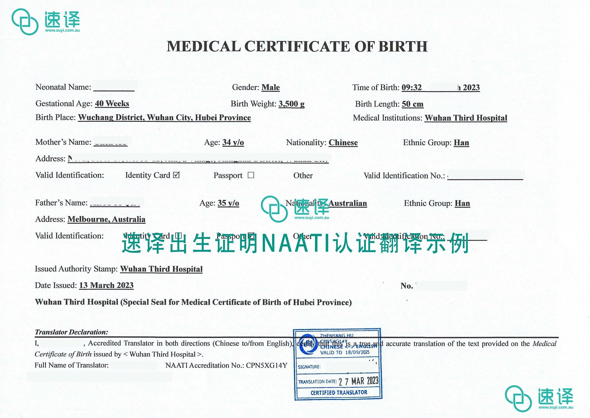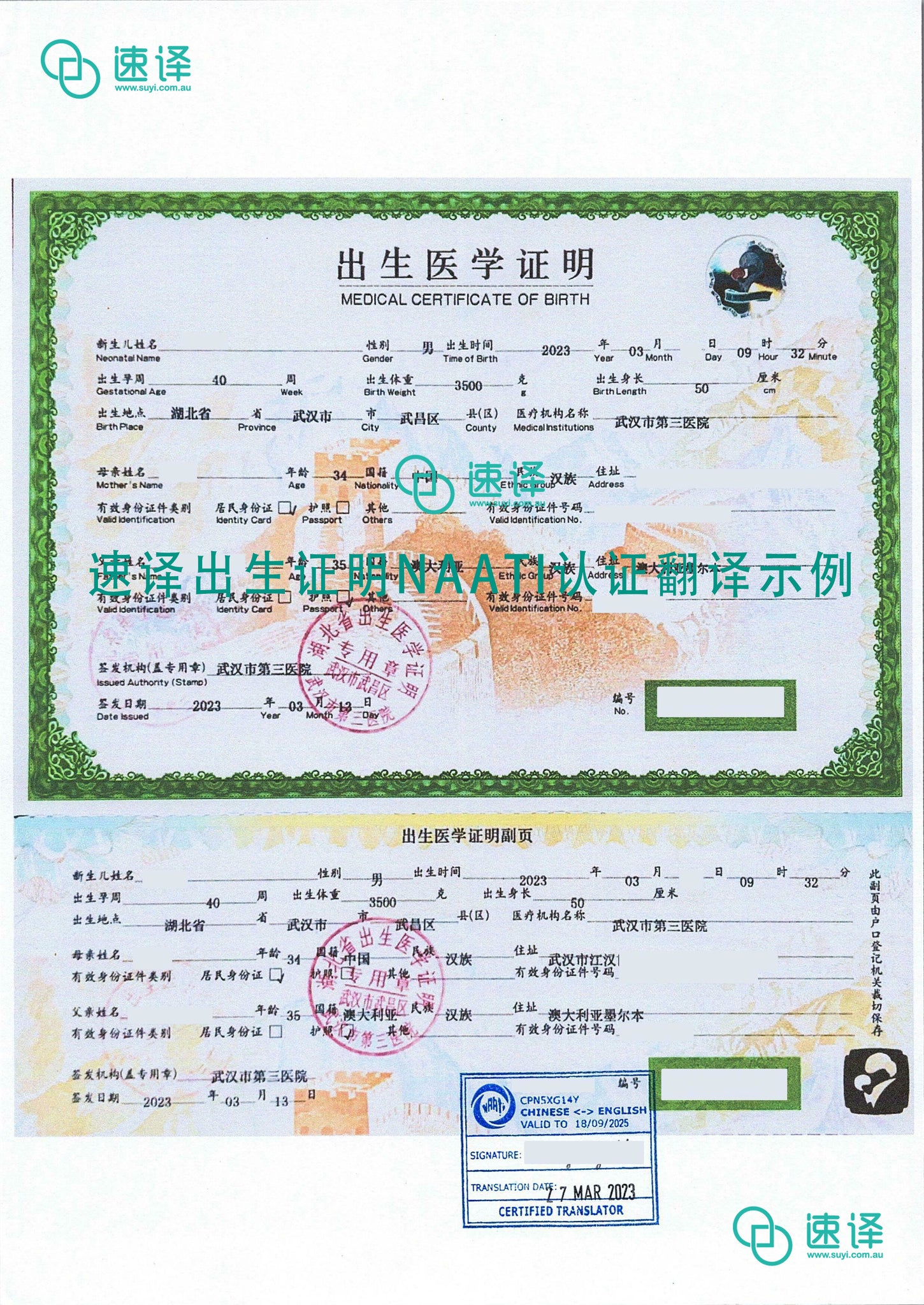 速譯為您提供NAATI認證出生證明翻譯服務,翻譯件經澳洲NAATI三級認證譯者翻譯蓋章與聲明,澳洲及各英語國家移民局認可,可用於簽證申請、留學申請等。
